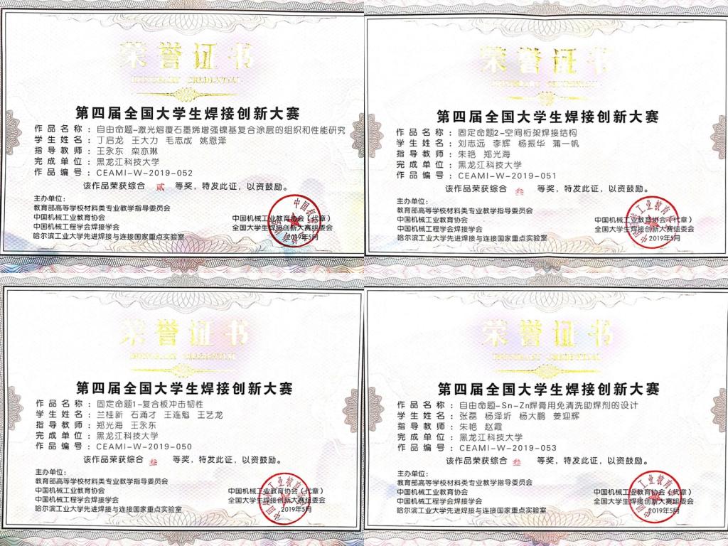 5月17日至5月19日,由教育部高等学校材料类专业教学指导委员会、中国机械工业教育协会、兰州理工大学省部共建有色金属先进加工与再利用国家重点实验室等单位主办的第四届全国大学生焊接创新大赛在兰州理工大学举行。经大赛组委会初赛选拔,共有来自哈尔滨工业大学、天津大学、江苏大学、哈尔滨理工大学、黑龙江科技大学等53所省内外高校的163支参赛队伍进入决赛,经过激烈角逐,beat365官网beat365中文版官网入口焊接技术与工程专业的4支参赛队在王永东、郑光海、朱艳等焊接教学团队教师的指导下取得佳绩,自由命题组焊接15级丁启龙同学的团队作品《激光熔覆石墨烯增强镍基复合涂层的组织和性能研究》获得二等奖,焊接15级张磊同学的团队作品《Sn-Zn焊膏用免清洗助焊剂的设计》获得三等奖,固定命题组焊接15级刘志远同学的团队作品《空间桁架焊接结构》和焊接15级兰桂新同学的团队作品《复合板冲击韧性》获得三等奖。