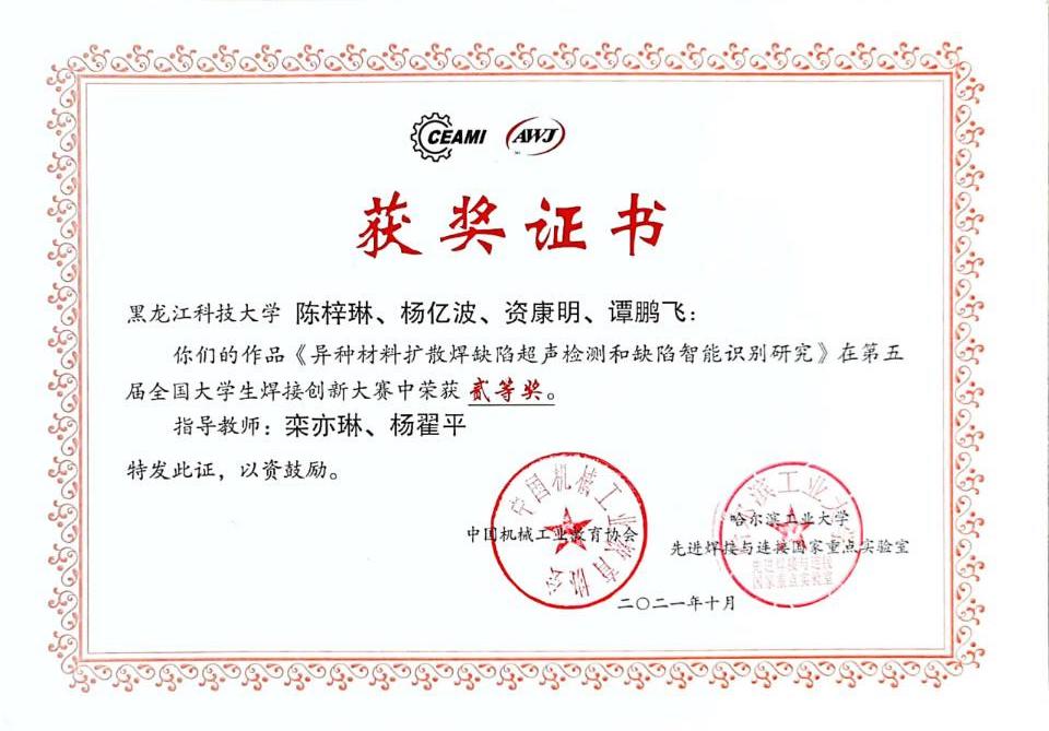此次大赛按固定命题项目和自由选题项目两大类分别进行。beat365官网焊接技术与工程专业教学团队从题目选择、材料准备、工艺和结构设计、创新应用等每个环节,师生共同研讨,反复试验。最终由朱艳老师带队,焊接专业本科生组成的4支队伍进入大赛决赛。经大赛初审,现场测试和答辩等环节,栾亦琳和杨翟平老师指导本科生陈梓琳、杨亿波、资康明、谭鹏飞的作品《异种材料扩散焊缺陷超声检测和缺陷智能识别研究》获得自由选题组二等奖,其它3件作品获得三等奖。