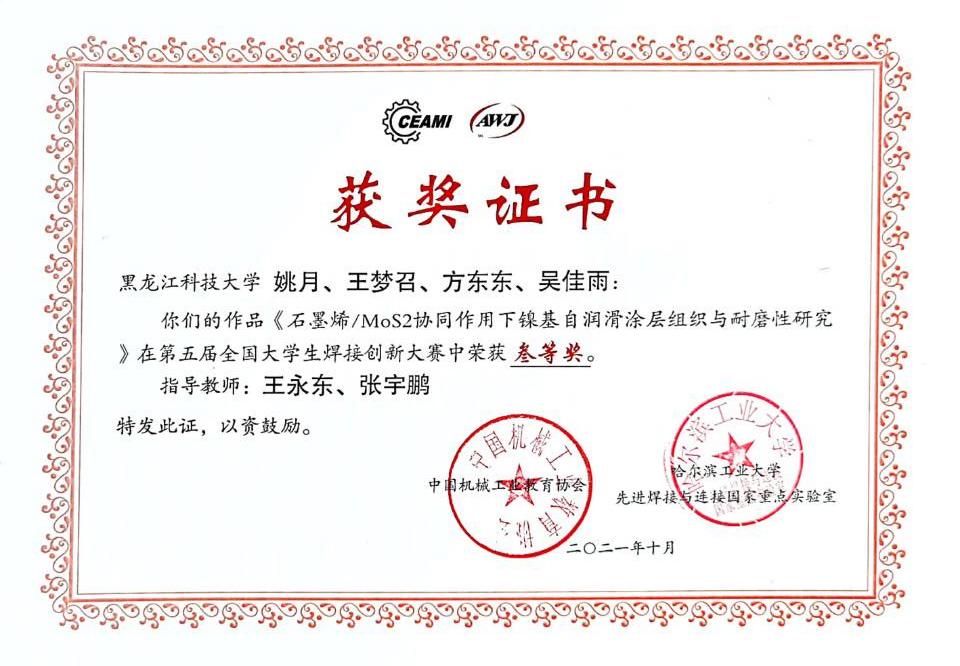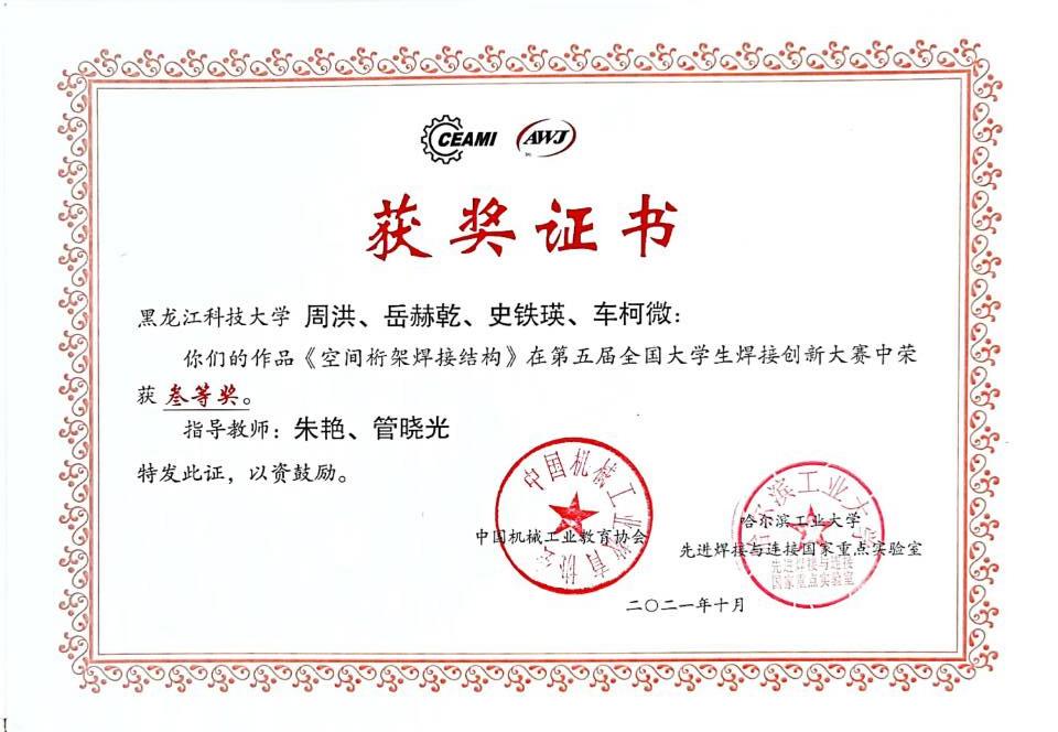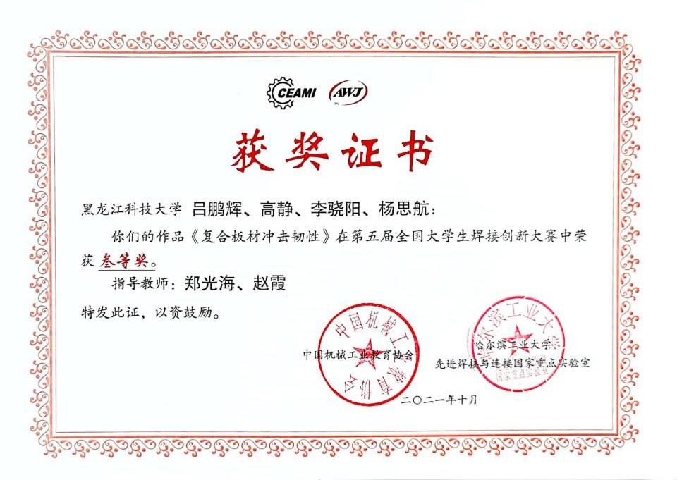 2021年10月20~23日,第五届全国大学生焊接创新大赛在哈尔滨举行,本届大赛由中国机械工业教育协会和哈尔滨工业大学先进焊接与连接国家重点实验室主办。来自清华大学、哈尔滨工业大学、天津大学、黑龙江科技大学等49所高校的148件作品入围决赛。在学校教务处、beat365中文版官网入口的高度重视和大力支持下,beat365官网代表队获得二等奖1项,三等奖3项的好成绩。