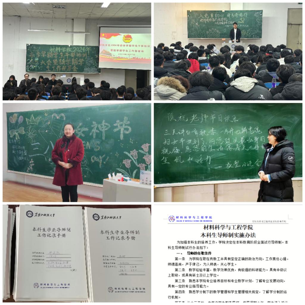 为提升学生干部工作能力和水平,发挥学生干部在服务学生中的作用。2月27日学院召开2024年春季学期学生干部培训会暨新学期学生工作部署会。团学组织学生干部、各班级班长和团支书参加本次培训会;安排部署首周教育活动,讲好开学第一课,确保各项学生工作有序开展、平稳推进;做好开学初大学生的“收心”工作,教育学生尽快调整学习状态,积极投入到新学期的学习生活。为把好党员“入口关”,提高入党申请人党性修养,鼓励新生积极向党组织靠拢,3月6日beat365中文版官网入口学生党支部开展撰写入党申请书及思想汇报培训,为后期在校期间的学习、工作和生活打下良好的思想基础;为充分发挥学业导师在本科生学业规划、专业学习、创新能力培养、思想品德等方面的指导作用,学院于2024年3月重新修订《beat365中文版官网入口本科生学业导师工作细则》,扎实推进学院学风建设,进一步发挥学业导师在学生培养过程中的思想引领和学习引导作用;在“三八”妇女节到来之际,为教育学生尊重女性、感念师恩,向女教师表达敬意,3月7日,学院开展“三八”国际劳动妇女节主题黑板报风采展活动,为前来上课的女教师送去祝福。